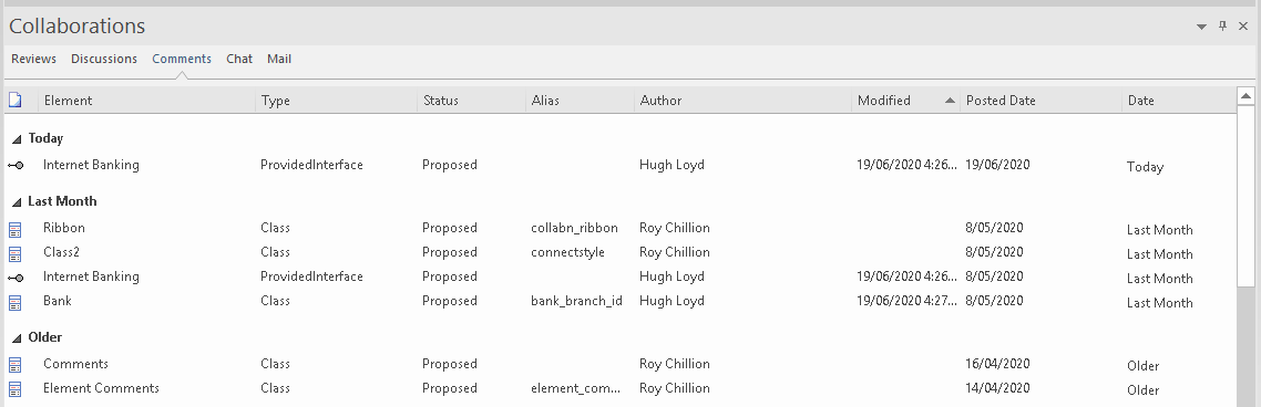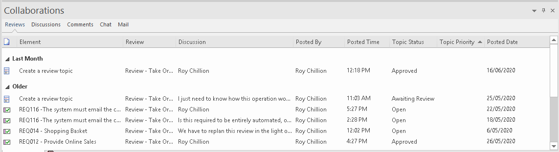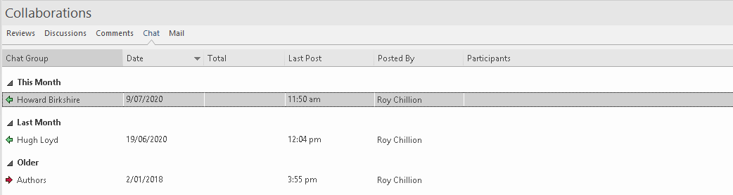 When the Collaborations window displays, it lists the items in which activity has occurred in date/time order. On the 'Reviews', 'Discussions' and 'Comments' tabs the items for today are listed first, in the Today group, followed in sequence by the items active Yesterday, This Week, Last Week, This Month and Last Month. The 'Chat' tab by default only shows the last posts made by each of your correspondents in a conversation, but you can adjust the timeframe to show all Chats posted over that period, grouped under the same category headings.