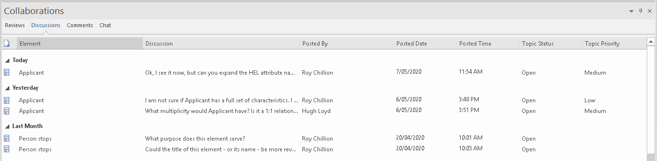 The 'Discussions' tab shows the Discussions that have been recorded on elements across the model, listing the elements under discussion and showing the text of the topic created against that element. Where there is more than one topic, the element is listed again for each topic. The tab does not list discussions concerning diagrams.