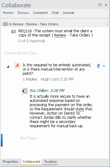 A Review element is a simple yet powerful mechanism for capturing, in real time, discussions concerned with a particular event on one or more elements and/or diagrams. Typically, a Project Manager or other coordinator will create a Review element specifically to discuss one or more objects for a project phase, project stage or other category of review, over a defined period. A number of reviewers then 'join' the review and enter discussion points and responses in the Collaborate window. Note that you can only be joined to one Review element at a time.