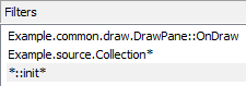 If the 'Enable ' checkbox is selected on the 'Recording' page of the Execution Analyzer Script Editor, the debugger excludes calls to matching methods from the recording. The comparison is case-sensitive. To add a value, click on the 'New' ('Insert') icon in the right corner of the 'Exclusion Filters' box, and type in the comparison string; each filter string takes the form: class_name_token::method_name_token The class_name_token excludes calls to all methods of a Class or Classes that have a name matching the token; the string can contain the wildcard character * (asterisk). The method_name_token excludes calls to methods having a name that matches the token; again, the string can contain the wildcard character *. Both tokens are optional; if no Class token is present, the filter is applied only to global or public functions (that is, methods not belonging to any Class). |