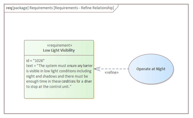 The Refine relationship can be drawn between a Requirement and any model element such as a Use Case, a StateMachine, or an Activity. The choice of model element will depend on the information expressed in the requirement and the discretion of the modeler or engineer.