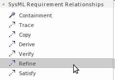 The Refine relationship is a relationship between a Requirement and another model element that adds refinement or additional information that helps clarify the requirement so that its meaning is more apparent. The Refine relationship is available from the 'Relationships' page of the SysML Requirements Toolbox.