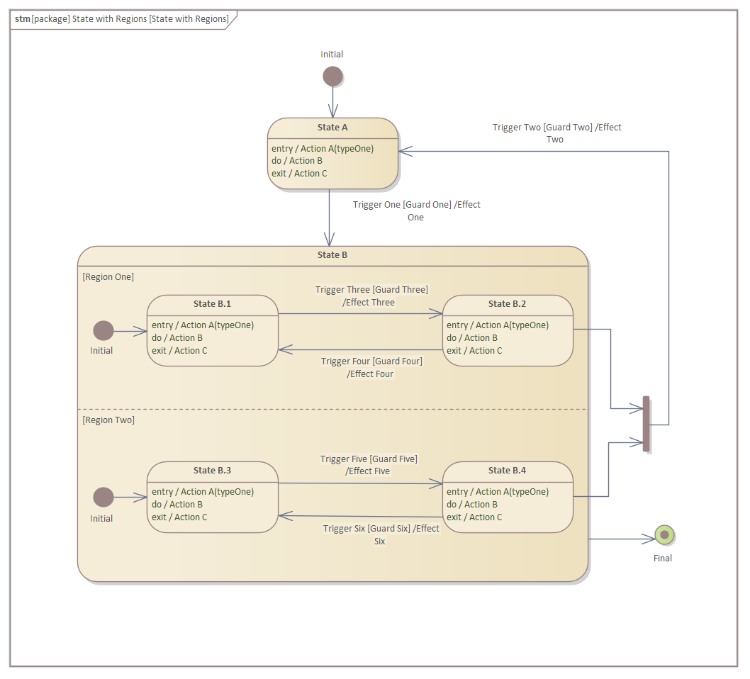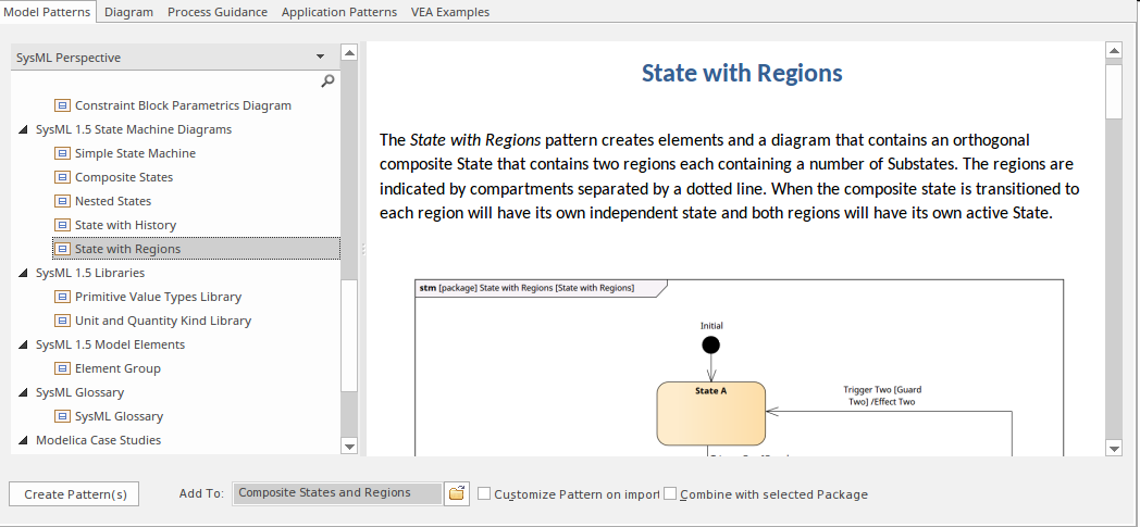 Enterprise Architect provides a useful starting point for modeling complex state behavior, by providing a series of model patterns that can be used to model all aspects of StateMachines, including modeling Composite States and Regions.