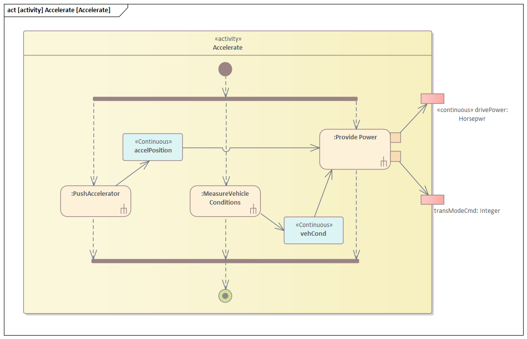 This diagram, describing a vehicle's acceleration, shows many of the elements that are commonly seen on an Activity diagram. You will see in the subsequent topics that it is a very expressive diagram that, if crafted carefully, can rigorously convey a lot of information.