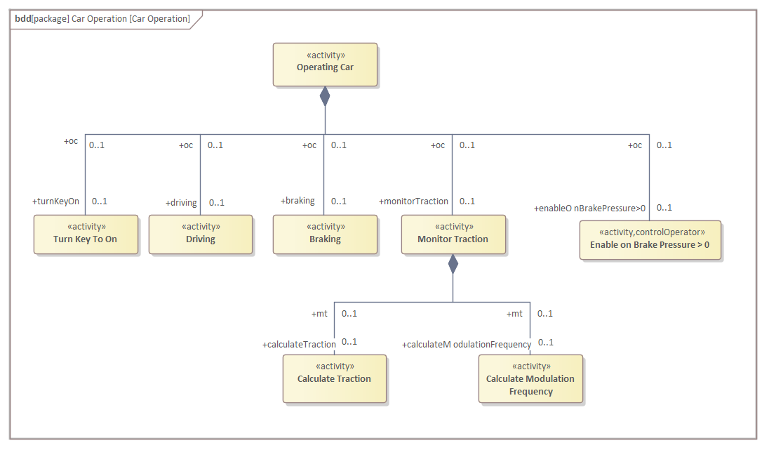 Newcomers to the Systems Modeling Language and Enterprise Architect might be surprised to learn that it is not Activities but Actions that are used on Activity diagrams. Activities that are the classifiers of Actions are typically visualized on Block Definition diagrams. This might seem a little counter-intuitive, but when you understand that the Action is the fundamental atom of system behavior it makes more sense. Activities are classifiers and as such can, like Block elements, participate in a wide range of structural relationships, which is why the relationships such as Associations marked with Composition can be used between Activities.