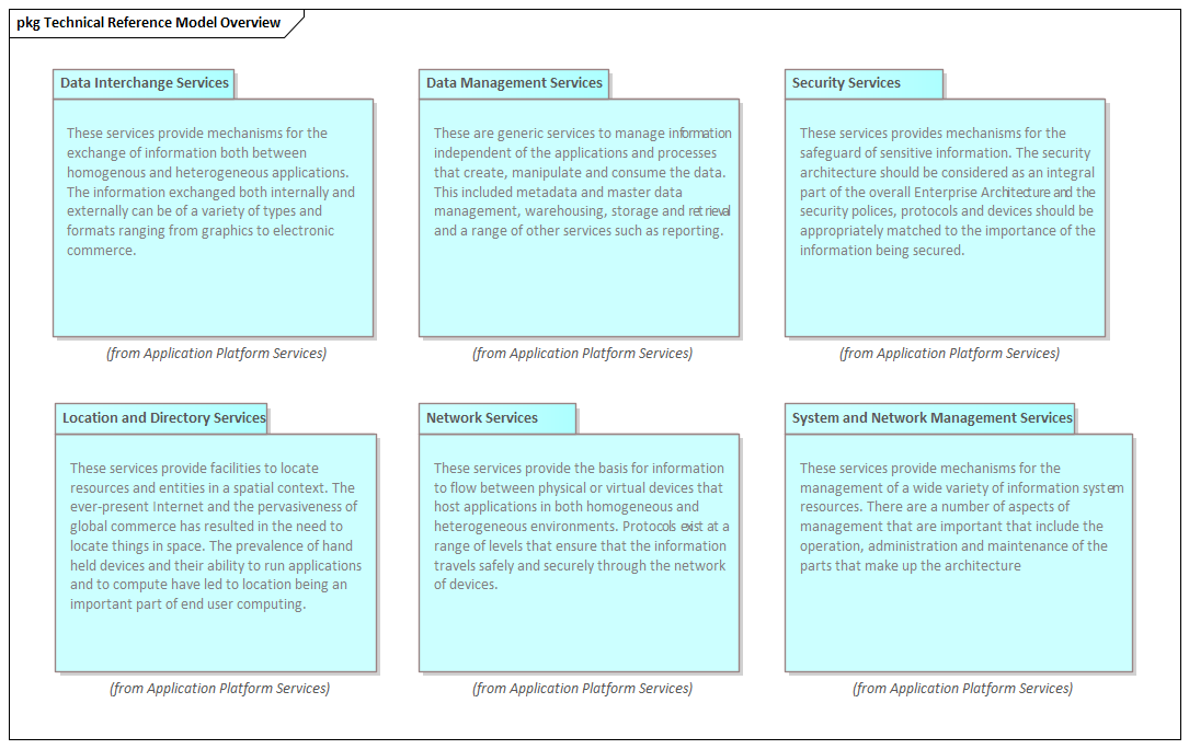 The concept of an Application Platform is described in TOGAF; it provides the benefit of portability and interoperability by defining a set of services that are made available to applications in a standard and repeatable way, and also by the fact that the platform is underpinned by communication infrastructure made accessible to the application platform through a standards-based communication infrastructure interface. This Package diagram illustrates the taxonomy of Platform Services.