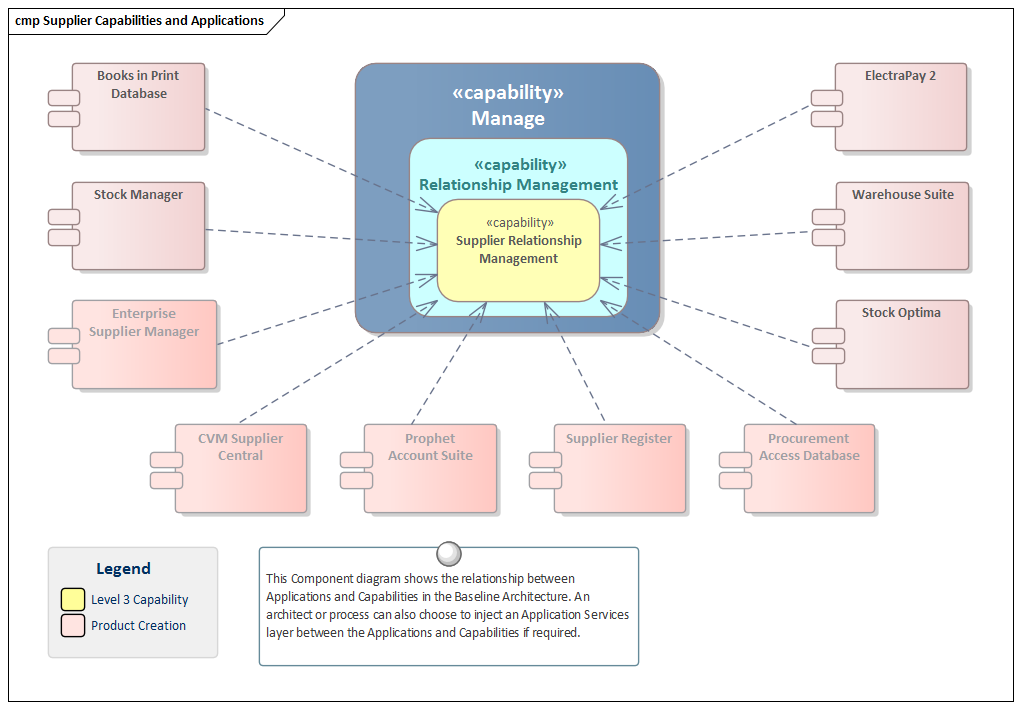 Enterprise Architect can also be used to define the baseline architecture by describing the existing applications that deliver a capability, or to define a target state by prescribing the planned applications that will deliver the capability. Regardless of the purpose of the architecture, the capabilities provide a sound and business-driven anchor point for the applications.