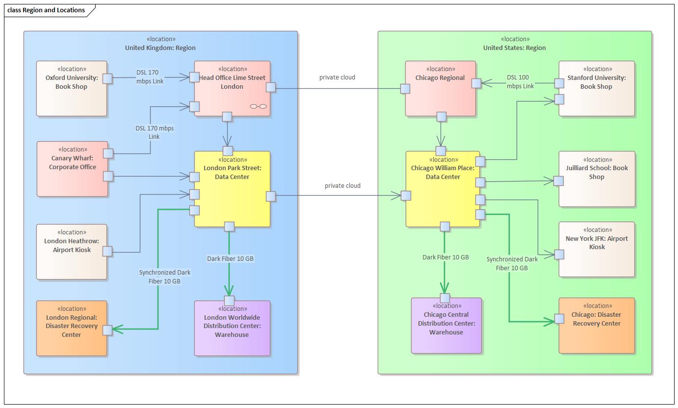 Enterprise Architect provides a wide range of tools for modeling locations at all levels, and this is particularly true at an infrastructure level. The same elements that are used to model the business locations can be augmented to create expressive models that represent how the infrastructure relates to facilities, including high level models of the communication fabric between different locations and the protocols used. Unified Modeling Language Ports allow drill-down to the internal structure of a facility. For example, a high level diagram might describe the communication path between a corporate office and a data center using a Port on the boundary of each facility. A child diagram could then describe the routers, switches, servers, and other infrastructure elements that make up the data center or corporate office.