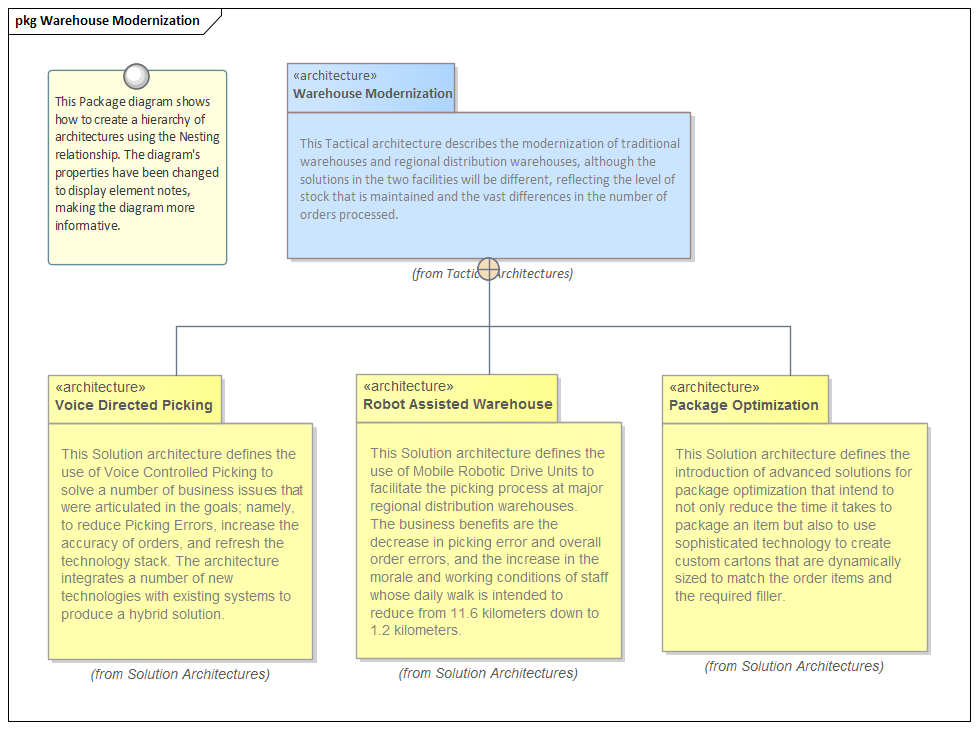 Enterprise Architect has a number of powerful features that will assist the architecture program to partition and maintain these levels of the architecture and their inter-relationships.