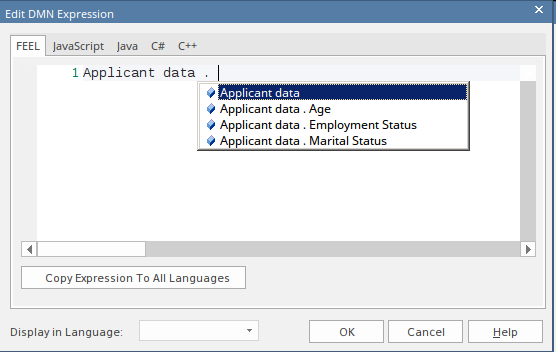 The expression Editor dialog is used for setting expressions in the Boxed content, Invocation and Literal Expression element types. It provides Intelli-sense support for constructing expressions based on the FEEL grammar, as well as the code languages that can be used for the code generation of the model.