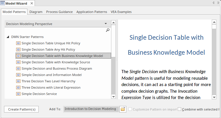 All of these facilities make it easy for a newcomer to get started, allowing you to become a productive member of a team and to start contributing to models quickly and without any delay. If you are a novice Requirements Analyst, you will be surprised how productive you can be when compared to working in text-based or other more rudimentary modeling tools. There will be challenges along the way as you push yourself and the tool to new limits, but a powerful Help system, a large community of users, comprehensive forums, a community site and first class support services will make the journey easy and informative. This image shows one of the built-in model patterns for the Decision Modeling perspective, with a range of useful patterns that can be automatically injected into your own models. Each pattern comes with accompanying documentation that explains how to use the pattern and helps ensure you follow best practice.