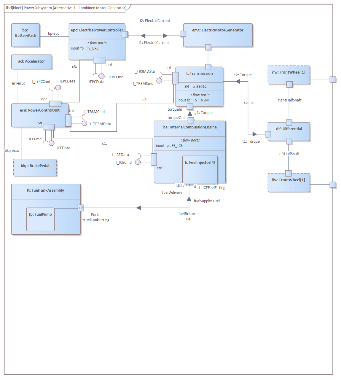 In an analogous way to how we showed the connections between subsystems, using an Internal Block diagram, we can do the same thing to represent the way that the parts of a subsystem are connected together. So we see again how the two diagram types, Block Definition diagram and an Internal Block diagram, can be used in tandem to describe the structure of a system and how we can move down a part hierarchy to a point where the complexity is understood and does not require further modeling.