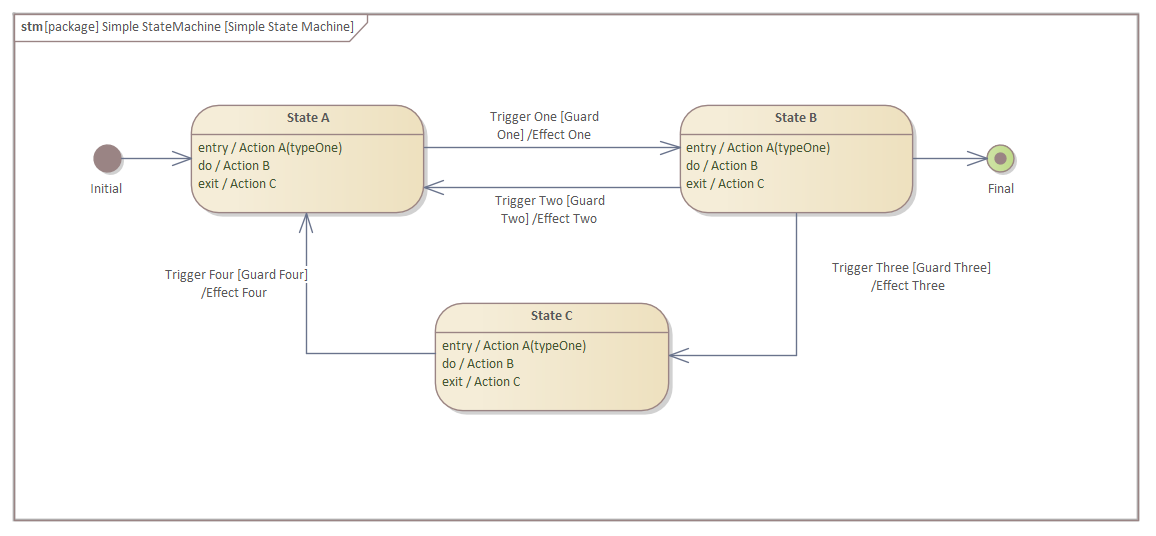 The pattern can be used to create a number of different StateMachines; in this example we create a simple (single region) diagram that has all the appropriate detail added to the States and the Transitions. A modeler can create this diagram in the appropriate location in the repository and then edit the States and Transitions and diagram to make it suit their own modeling context. The initial StateMachine diagram created from the pattern will resemble this: