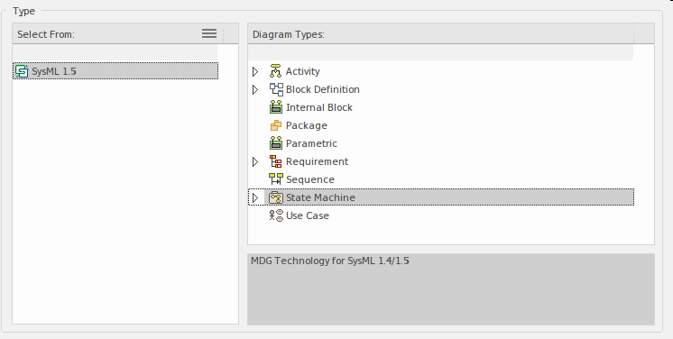 Selecting this option will open the New Diagram dialog, allowing you to name the diagram; the name will default to the name of the Package or element that contains the diagram, but you can change it. With the SysML perspective chosen and the version of SysML selected, a list of diagrams will be displayed from which you can select the StateMachine diagram. Once the is selected a new StateMachine diagram will be created in the location selected in the Browser. The diagram canvas will be opened, allowing you to start adding elements and connectors that describe the important phases in the lifetime of the subject. Enterprise Architect will also display the StateMachine pages of the Diagram Toolbox, which contain the elements and relationships defined by the SysML specification to be applicable for constructing StateMachine diagrams. Any number of other Toolbox pages can be opened if required, in addition to the Common (Elements) and Common Relationships pages that are always available.