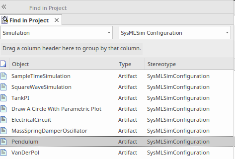 With the model loaded we can use the OpenModelica features within Enterprise Architect to locate the Pendulum example in the model. It is common for a model of a complex system to be very large, and there could be any number of existing simulations set up, so Enterprise Architect provides a mechanism to search for these simulations.