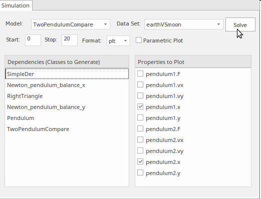 Selecting this option will return a list of SysML simulation configuration artifacts, which are the elements where the OpenModelica details are specified. From this list we can select the Pendulum example, which will launch a window that can be used to configure and solve the problem codified in the example. To be able to run the simulation, a version of OpenModelica must be installed on the machine that is running Enterprise Architect. Details on how to install OpenModelica are contained in the next section.