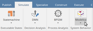 The OpenModelica features are conveniently grouped in a single location with other simulation capabilities, and can be launched using the Modelica/Simulink menu available from the 'System Behavior' panel of the 'Simulate' ribbon. The OpenModelica facility keeps company with other simulation tools such as Executable StateMachine, Decision Modeling Notation and BPSim.