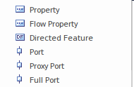 - Drag-and-dropping the appropriate Port from the Toolbox onto the Block - this diagram shows the section of the Block Definition Toolbox that lists the Ports