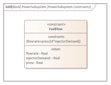 In an earlier topic we learnt how equations can be modeled using the Block Definition diagram, with the Part Association relationship articulating the variables (parameters) of the equation. This provides a powerful mechanism for re-use. As a refresher of how we use a Constraint Block to model equations refer to this diagram, which uses a Constraint (which is a stereotyped Block) to model a vehicle's fuel. The Fuel Flow Rate is based on an equation that has fuel pressure (press) and fuel demand as variables (parameters).