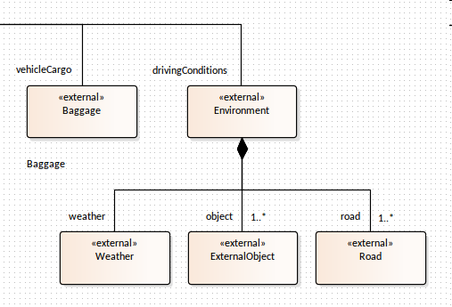 This Internal Block diagram depicts a user defined usage of the diagram type which depicts the system in the context of its environment.  The «system» and «external» stereotypes are user-defined and not specified in SysML, but help the System Engineer describe the system of interest relative to its environment.