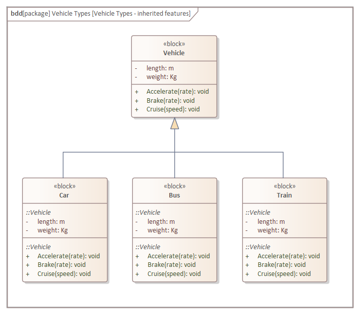 One of the powerful language mechanisms that results from Generalization is for the specialized elements to inherit the structural and behavioral features from the generalized element. So far in the example diagrams the engineer has chosen not to display these inherited features, but they can be set to be displayed using the compartments sections of the element's Property sheet.