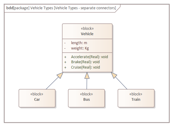 When a Block participates in a generalization hierarchy and has a number of specializations, the connectors emanating from the Block can become untidy. Enterprise Architect provides a mechanism to change the line style to any one of a number of styles, but probably the most useful style is the Vertically-oriented Tree style, which groups the heads of the relationship together and allows their tails to be aligned in parallel.