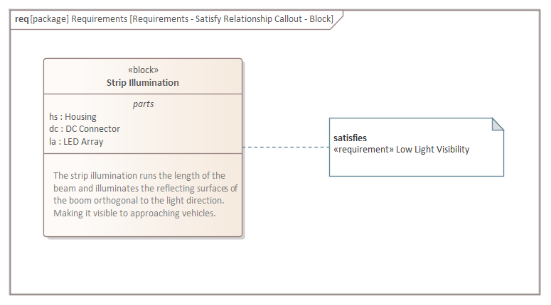 The relationship drawn between two elements visible in a diagram is the most common way to visualize Requirement relationships; the dashed line is drawn from the client (the dependent element) to the supplier (the providing element). So in this example the 'Strip Illumination' Block is the client and it depends on the 'Low Light Visibility' Requirement, so the arrow points from the Block (client) to the Requirement (supplier).