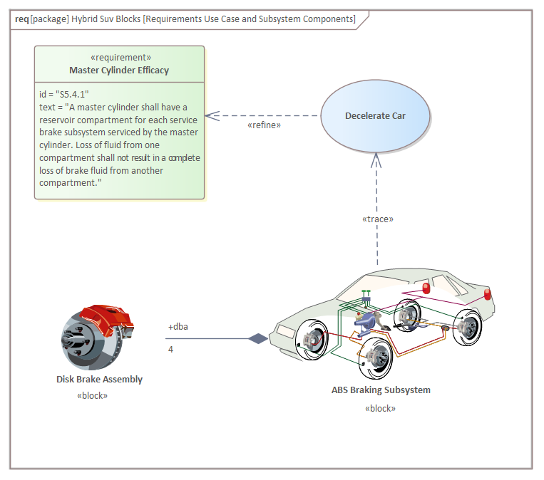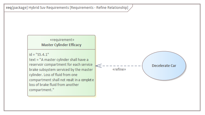 In these two diagrams the modeler has used the <<refine>> relationship to indicate that the Decelerate Car Use Case refines or adds additional explanation to clarify the Requirement Master Cylinder Efficacy. This provides a powerful mechanism to trace implementation level components that are connected to the Use Case back up to the Requirement and ultimately to the Stakeholder.