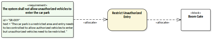 The Requirements diagram can be used to visualize Requirements and their relationships to other elements, including other Requirements. You can of course view Requirements in a number of other ways, but for many stakeholders the Requirements diagram will be more appealing as it provides a graphical way to view the Requirements' connections to other important parts of the model, including stakeholders, architecture, design and tests. This diagram shows how Requirements can be viewed along with their connection to other elements. A Requirement stating that unauthorized vehicles should not be allowed to gain access to the car park is allocated to the Activity 'Restrict Unauthorized Vehicles', which in turn is allocated to a Block representing the Boom Gate.