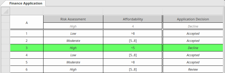 As you are stepping through the simulation, Enterprise Architect will display the selected rules in the expression editor and - in the case of a Decision Table - the rules that were fired will be highlighted in the table, allowing the simulation audience to see the rules clearly. The simulation will be paused at this point and will wait for the modeler to press the again to resume the simulation.
