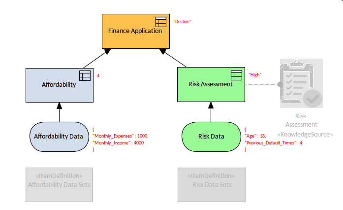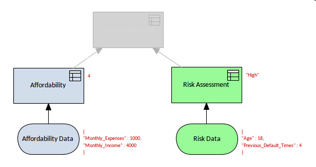 The next diagram shows the final result of the simulation, and unfortunately the Applicant's finance application would be declined using the data sets provided. This is indicted by the final output annotation to the right of the Finance Application decision, which is the highest level decision in the hierarchy.