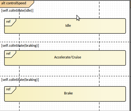 This diagram uses a type of element called a Reference, which acts as a place holder for another Sequence Diagram. Enterprise Architect conveniently allows these diagrams to be opened by double-clicking on the 'ref' element in the diagram.