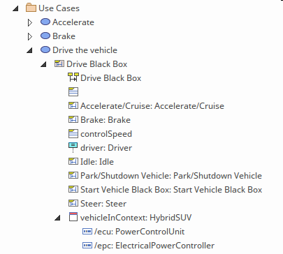 Enterprise Architect allows the Sequence Diagram to be defined as a child of the 'Drive the Vehicle' Use Case making it easy for a modeler to access the diagram and view it in the context of the goal the Driver is wanting to achieve with respect to the vehicle.