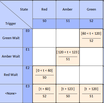 This diagram of the changes of a traffic light, like any StateMachine diagram, can be converted to a State Table.