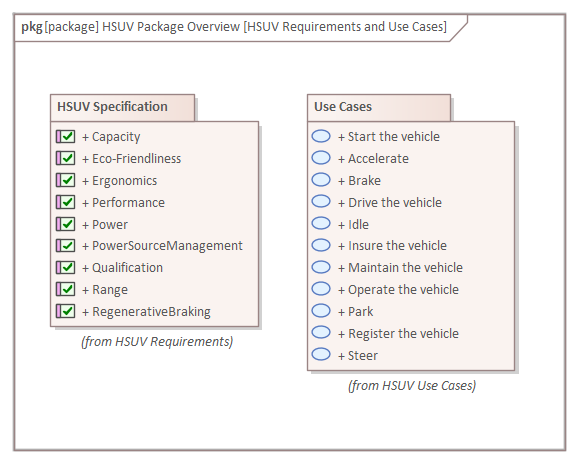 As with all SysML elements, there is both a graphical and textual aspect to the elements, notes can be added to each of the Packages and the relationships to clarify the purpose of the element or the connector. The Package diagram can contain any type of model element but typically it contains Packages. Enterprise Architect extends the SysML specification by providing a number of different and innovative ways to visualize Packages and their content on a Package diagram. These options can be seen in the menu that is displayed when a Package is dragged from the Browser window onto a diagram.