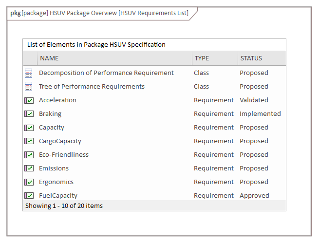 In the next diagram the engineer has chosen the 'Package as List' option, which relies upon auto-generated but user-configurable SQL code to create a dynamic list of elements based on any of the Package element's metadata. Here we see the same list of requirements but this time a number of properties are also displayed.