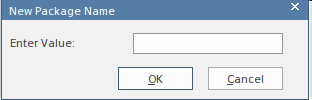 Elements can be added to the diagram by dragging-and-dropping them from the Toolbox onto the Diagram View. It is considered good practice to start by defining Model and Model Libraries. When a Model or Model Library icon is dragged from the Toolbox to a diagram, the modeler will be prompted to enter a new Package name using this dialog: