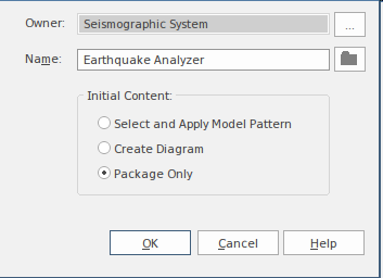Once the Package name has been entered a new Package element will be created on the diagram. When creating a Package from the Toolbox or inserting one into the Browser window, a modeler is given a number of options as indicated on the dialog in this screen capture.