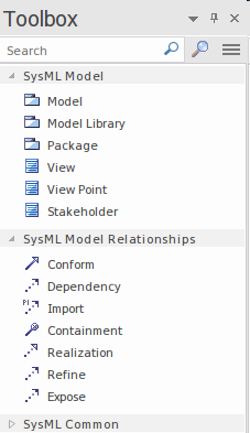 Selecting this option will open the New Diagram dialog, on which you name the diagram; the name initially defaults to the name of the Package or element that contains the diagram. With the SysML perspective chosen and the version of SysML selected, a list of diagrams will be displayed from which you select the Package diagram. Click on the to create a new Package diagram in the location selected in the Browser window. The Diagram View will be opened, allowing you to start adding elements and connectors that describe the structure of the system and its division into these structural groups. Enterprise Architect will also display the 'Package' Toolbox pages that contain the elements and relationships as defined by the SysML specification to be applicable for constructing Package diagrams. Any number of other Toolbox pages can be opened, if required, in addition to the 'Common' elements and 'Common Relationships' pages that will always be available.