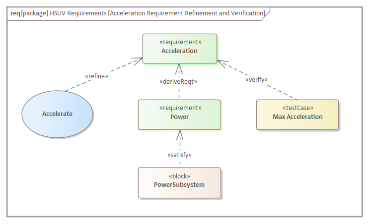 There is a rich set of requirement relationships that allow the Requirement elements to be connected to other modeling elements including other Requirements. The relationships include:
