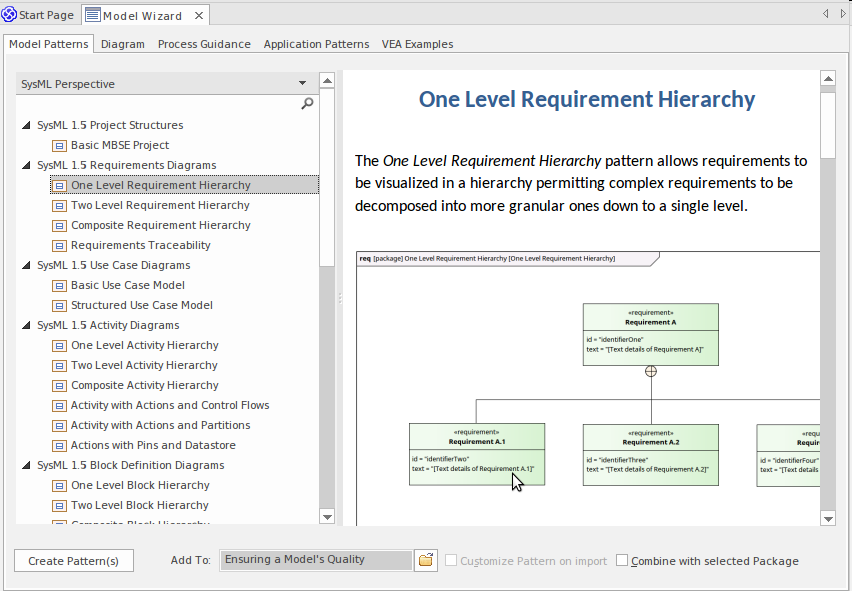This diagram shows the Model Patterns in action where novice and experienced modelers alike can, with a single button press, create well formed models and diagrams using a productive corpus of industry best practice models - all SysML compliant. There is also a detailed explanation and discussion on how to use the pattern next step, where to get further help and more. For more information see the Model Wizards Help topic.