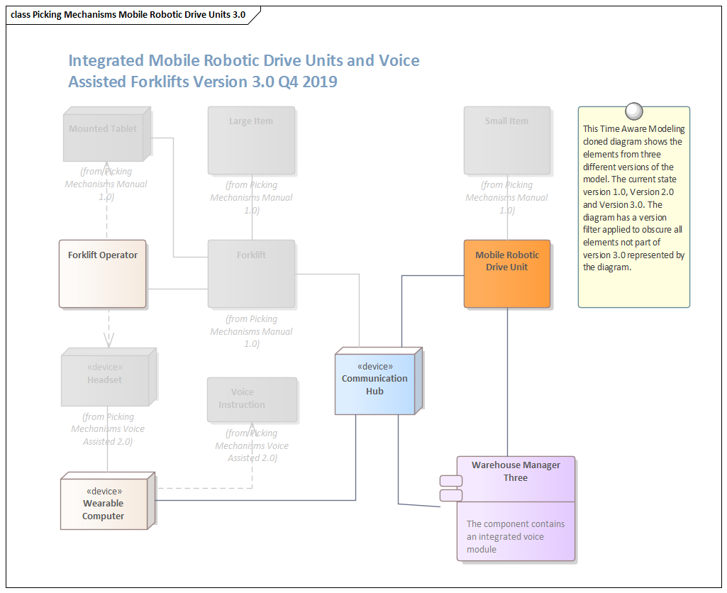 Time Aware Modeling is a powerful and expressive technique for defining and visualizing how models change over time. The technique allows different versions or states of a model to be created to represent how the model will change with the passage of time. This includes elements and features that are changed, deleted or added at a point in time. The technique works by allowing a modeler to clone a Package, diagram or element in a model. When this is done, the complex task of maintaining the relationships between previous versions is managed by Enterprise Architect.