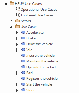 The Use Cases appear in the Browser window and can be conveniently grouped into Actors and Use Cases. Any number of Use Case diagrams can then be defined that allow the Systems Engineer to visualize the Use Cases.