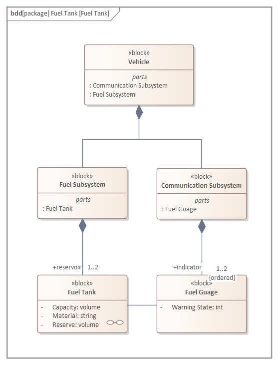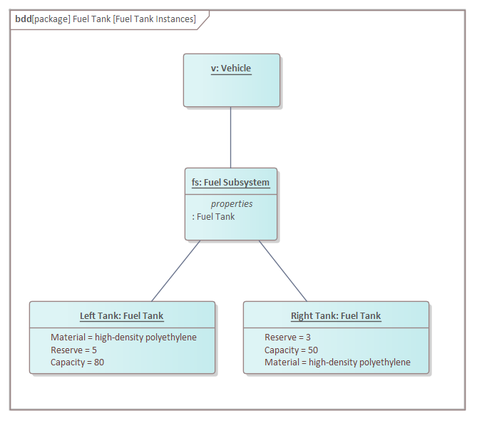 In the Fuel Tank diagram the car is modeled as a classifier (Block) level, where the model is describing a generic vehicle and representing the fact that a vehicle could have one, or a maximum of two, fuel tanks. This Fuel Tank Instances diagram, however, describes a particular vehicle that has two fuel tanks that have different capacities and reserve volumes.