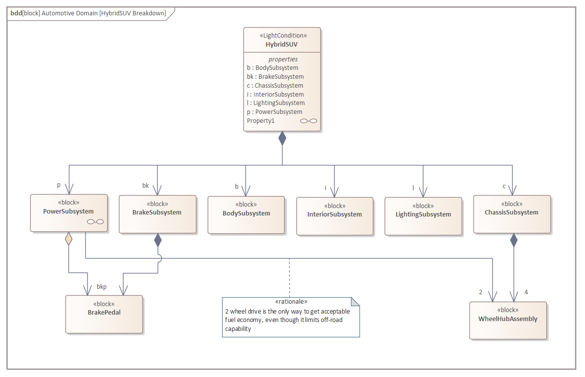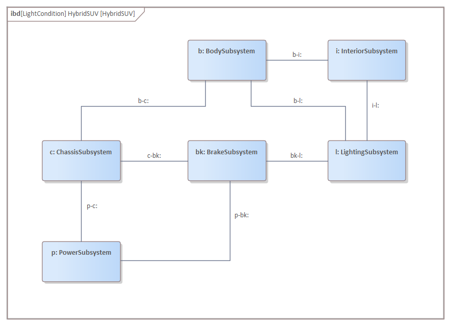 Some relationships have been suppressed in the diagram; for example, the Power Subsystem would typically have a connection to the Lighting Subsystem. This point is important, as newcomers to SysML and Enterprise Architect often think that every defined relationship should be displayed in a diagram. While this statement appears to be true it is important to remember that a modeler, like a cartoonist creating a caricature, will often leave details out of illustrations to focus the viewer's attention on other subjectively more important elements and connectors.
