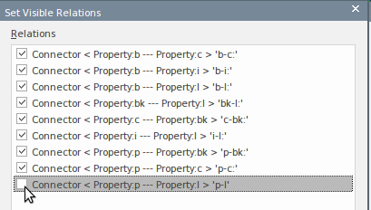 If a connector is not checked in this dialog it will not be displayed in the current diagram. It might, however, be visible in other diagrams where the connected elements are displayed. This can be set from the 'Layout > Diagram > Appearance > Visibility > Set Visible Relationships' ribbon option.
