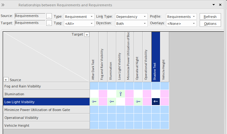 Where a relationship exists an arrow icon will be displayed in the cell at the intersection of the source and target elements, with the arrowhead showing the direction of the relationship. The matrix can also be configured to highlight the rows or columns that do not have any relationships in a separate color. This and other options can be configured on the Options window, available from the in the Relationship Matrix header.