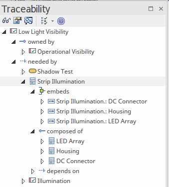 The Traceability window is a powerful and unique feature of Enterprise Architect that allows relationships to be explored, so that the modeler can effectively take walks through the graph of elements and their connections. It is a useful window to have open when you want to view how an element is connected and also what the connected elements are connected to. So, for example, in this model of the Boom Gate when the 'Low Light Visibility' Requirement is selected, the Traceability window will show that it is connected to the 'Strip Lighting' Block that satisfies the requirement.