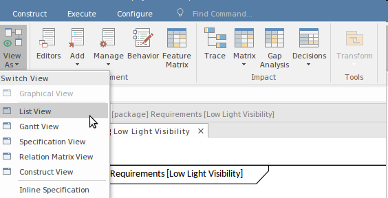 - List View - a table-based view similar to a spreadsheet where the properties of multiple elements can be viewed