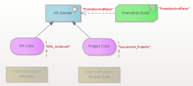 The HR Review Decision element does not itself define rules but rather is of type Invocation, which calls the services of the Promotion Rules element. This is a Business Knowledge Model (BKM) that can be reused in different contexts. The BKM defines the rules for promotion in a Decision Table that is stored internally, and when it is called it passes the resulting output back to the Decision element.